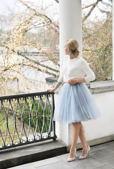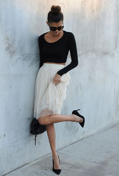 Nhắc tới những cô vũ công ba lê, người ta sẽ ngay lập tức nhớ tới hình ảnh của những chiếc váy vải voan mỏng manh với những đường xếp ly yêu kiều, với chất vải mỏng tầng tầng lớp lớp xuyên thấu, được làm từ chất liệu cotton hoặc pha nilon. Những chiếc chân váy này luôn xòe bồng bềnh rực rỡ, đem đến vẻ ngoài cực nữ tính, duyên dáng, mỏng manh. Được cách điệu, “nâng cấp” để hòa nhập vào với thế giới muôn màu muôn vẻ của thời trang, chân váy theo phong cách này cũng có đa dạng kiểu dáng khác nhau như dáng váy maxi dài chấm gót, xếp ly, xếp tầng hay thậm chí cả thêu đính tinh tế, màu sắc thường là pastel ngọt ngào hoặc đen trắng đơn giản. Cách phối đồ với những chiếc chân váy này cũng vô cùng đơn giản, dễ dàng nhất là phối chúng với những chiếc áo thun, phông dáng hơi ôm sát hoặc sơ vin. Thế nhưng vào những ngày trời trở gió hơn chút, hãy thử trải nghiệm những chiếc áo khoác hơi hầm hố như áo khoác da, áo bomber… chắc chắn các quý cô sẽ phải trầm trồ trước hiệu quả mà chúng đem lại.